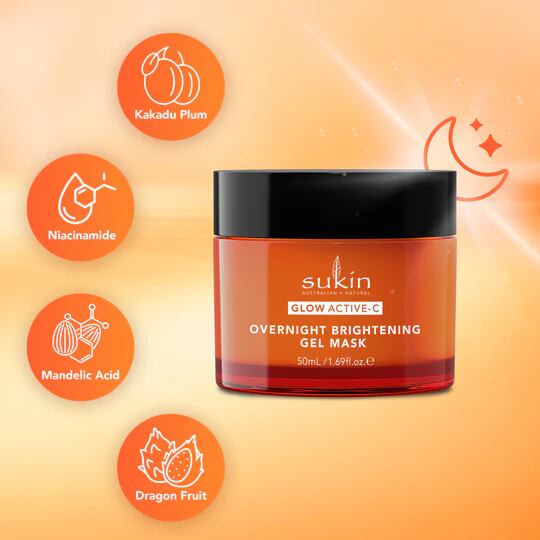 Achieve radiant, refreshed skin overnight with Sukin’s Glow-Active C Overnight Brightening Mask. Infused with Dragon Fruit Extract, Mandelic Acid, and Niacinamide, this lightweight gel hydrates, exfoliates, and revives dull skin while you sleep. Wake up to a smoother, brighter complexion and a natural glow by morning. Let your skin rejuvenate effortlessly as you dream.